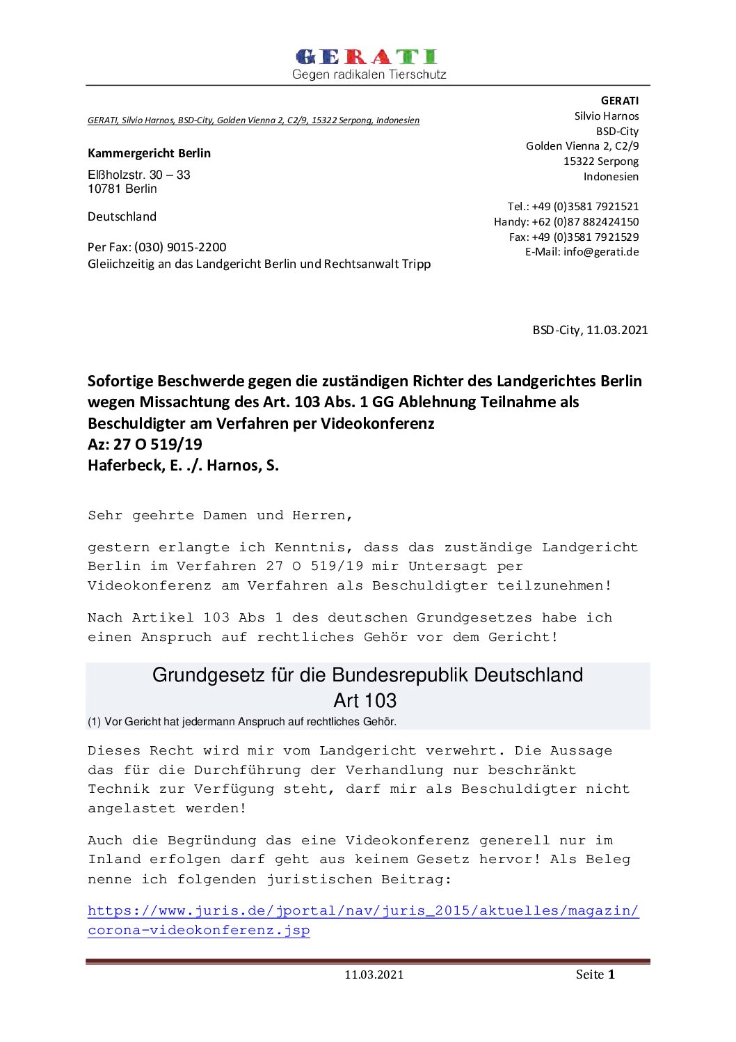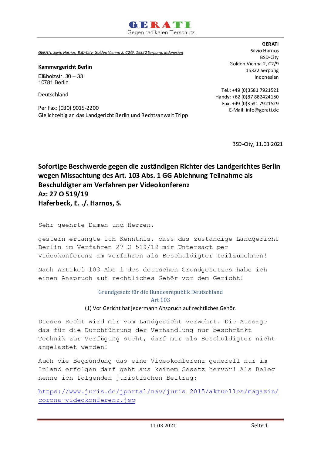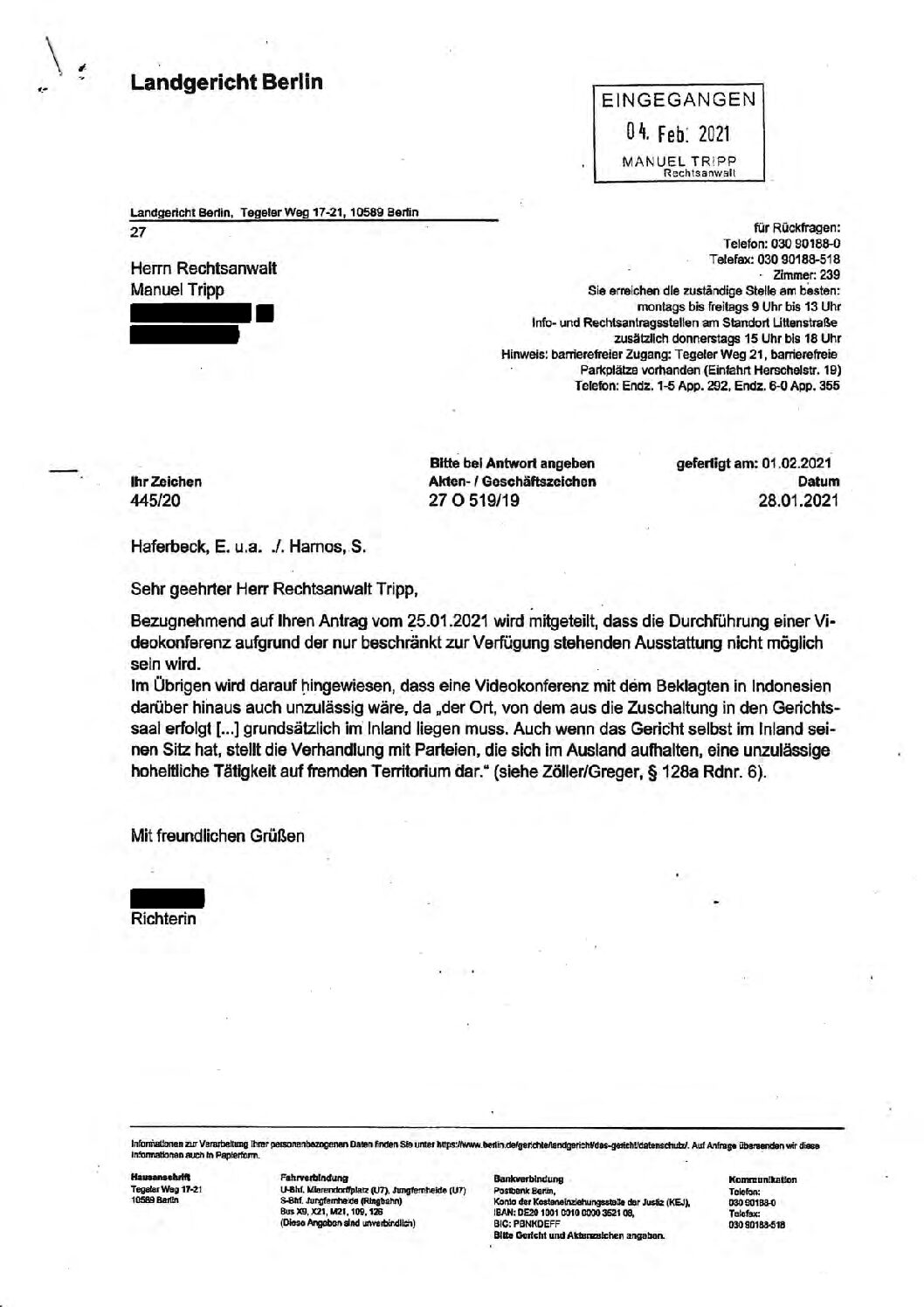 Am letzten Donnerstag erhielt ich von meinem Rechtsanwalt die Stellungnahme der Richter des Landgerichts Berlin zu meinem Befangenheitsantrag. Dazu bezog ich heute Stellung!